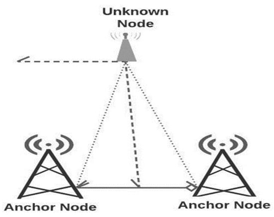 The angle of arrival (AoA) measurement technique is called the path of arrival or orientation measurement. The AoA is determined either by using the amplitude response of receiver antennas or the phase response of receiver antennas [16]. The angle is calculated when the maximum signal emerges from the anchor node to the unknown sensor node. An unknown sensor node’s location is considered a line that makes a certain angle with the anchor node, as shown in Figure 3. Therefore, it requires at least two anchor nodes for determining the position of the unknown node. In this technique, a measurement error occurs due to multiple paths or shadows, leading to higher error in localization [16].