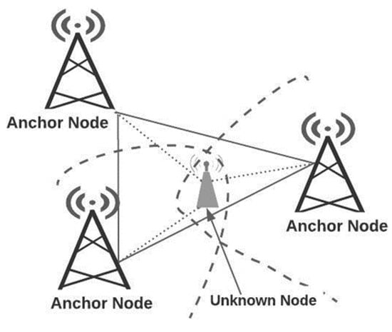 The time of arrival (ToA) measurement technique uses the propagation time, i.e., the time required for the signal to travel from the unknown node to the anchor nodes. The unknown node is to be in the range of anchor nodes. This technique requires at least three anchor nodes for determining the position of the unknown node. The assessed location of the unknown node falls inside the intersection area of the three circles, as represented in Figure 4. The realistic assessed location can be determined using the least square or weighted least square method [19].