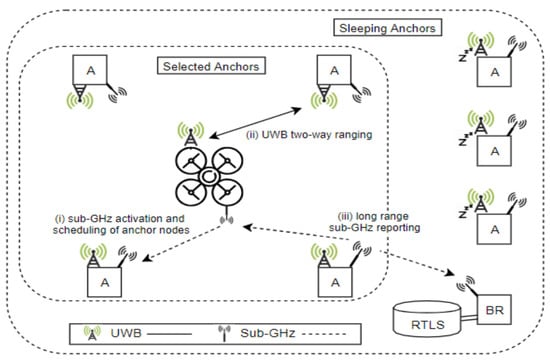 Additionally, this moving anchor node organizes and forms a self-organized wireless network. Besides, the high determination of UWB signals at various base stations can be reassembled jointly, trusting the density renewal procedure [57]. The synchronization of the clocks at the base stations is required so that the period variances of the impulses will imitate the geometrical alterations at other base stations. This process of localization is presented in Figure 11.