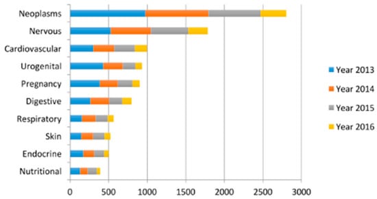 In conjunction with WSNs the IoT brings an unprecedented amount of data that the network infrastructure needs to handle. The solution for these problems is to customize the traditional network designs to the latest standards of network intelligence, which ensures optimal security [29]. Hospitals, clinics and care facilities need one cost-effective network infrastructure, the security of which complies with data protection regulations but is also easy to use and to operate. Figure 3 shows the leading disease types considered in the artificial intelligence literature.