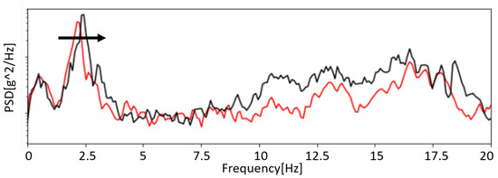 SHM frameworks usually process acceleration data for monitoring structures’ health status [23]. The datasets used in the study contain 3-axial accelerations data acquired with the previously described framework. As mentioned above, the viaduct underwent a technical intervention to strengthen its structure, with a corresponding change in the natural frequencies of a bridge. Figure 2 shows how the power spectrum density, averaged over 6 h, is modified before and after the intervention.