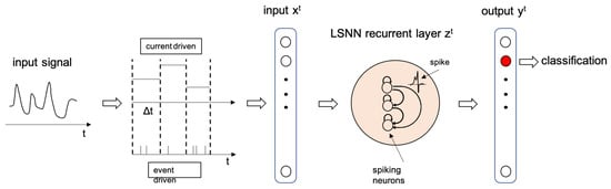 The recurrent LSNN structure is depicted in Figure 3, where the input, output and recurrent layers are represented. The input is a signal while the output is a classification encoded in the output neurons, meaning that each output neuron represents one of the possible classes. For instance, the neurons generating the highest output values is the one representing the recognised class. The time it takes to the network to process every single input and produce a stable output is called inference time (). As explained later in this Section, the input to the network can be either of current or event type. A current input type is a constant value over a time t = , while an event input type is a train of spikes, encoding the input signal using one of the possible methods described in Section 2.4.