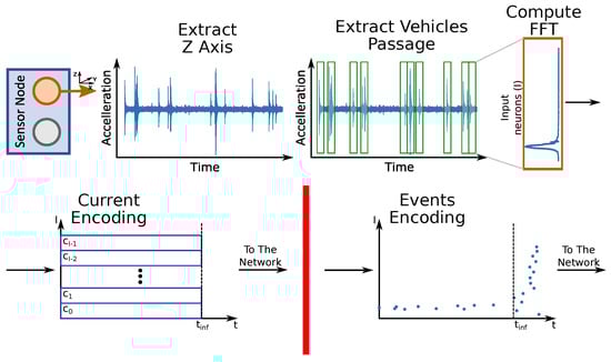 The LSNN we used in this work can work with two types of input encodings: Current (current-driven) or events (events-driven). In the Current-Driven LSNN, the input signal is constant for all the inference time, while in the Events-Driven LSNN, the signal is first encoded as spikes and then provided as input. This section describes some of the state-of-the-art encoding methods and details the algorithm we implemented to encode acceleration signals coming from the MEMS sensor. Considering Figure 2, which shows the frequency shift that we want to detect, we give as input to the network the FFT of the acceleration signal due to the vehicle crossing the viaduct.