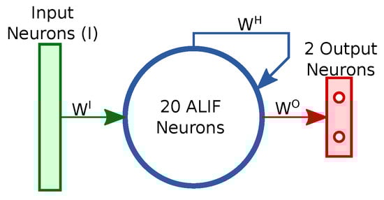 The network used in this work is described in [19]. The input layer is composed of input neurons (I) which are connected in an all-to-all fashion through the matrix to the recurrent layer, which is composed of Adaptative-Integrate and Fire neuron (ALIF). The recurrent layer is connected recursively to itself with an all-to-all connection matrix , and it is linked to the output layer in an all-to-all fashion with the matrix . The ALIF neurons are described by two state variables v and a. The first one is called membrane potential and increase when the neuron receives a stimulus (spike or current). When the v reach a value called , it emits a spike. The ALIF neurons have a changeable ; this behaviour is described by a the second state variable. The following equations describe an ALIF neuron: