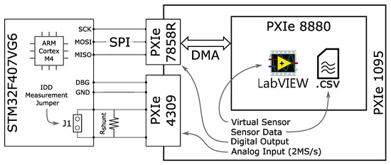 Architecture of the hardware-in-the-loop test system. The PXI system comprises a PXIe-4309 Analog Input module to monitor current consumption in each stage of the pipeline. The PXIe7858R FPGA, along with the PXIe-8880 Windows 7 controller, implements the Virtual Sensor and allow loading MEMS readings from a CSV file in real-time, emulating a real buffered digital MEMS node in hardware. The whole application runs on a STM32F4 development board featuring a Cortex-M4 ARM core.