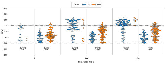 Inference ticks and number of inputs impact on MCC using the Current Input and the Event Input. Each point is a configuration of LSNN, which is characterised by its hyperparameters.