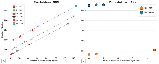 (A) Cycle count for the event-driven eLSNN for the best configurations (input number with different colours, and inference ticks with different markers) computed on minimal, median and maximal spike activities on the input-layer (x). (B) Cycle count for the current-driven eLSNN computed on minimal, median and maximal spike activities on the recurrent/hidden-layer (z). Different colour represent different number of inputs configuration for the eLSNN. All networks have an 10 inference ticks.