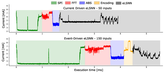 Figure 12 shows the MCU’s current consumption when executing the entire processing steps needed to read the sensor values through the SPI interface, pre-process the sample (FFT + ABS), and compute the eLSNN kernel. We report the current-driven eLSNN in its most efficient configuration on the left plot, and on the right plot, we report the event-driven eLSNN in its most efficient configuration. Even if the event-driven eLSNN kernel costs halves of the cycles than the current-driven eLSNN, it requires three times more sensor’s readings to compute an inference for an input sample. This increases the cycles needed to read the sensor’s data in SPI and compute the FFT and abs. Moreover, the event-driven eLSNN requires an additional pre-processing step consisting of the coding of the spectral components in spikes/events described in Section 3.