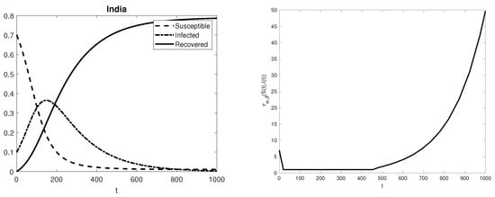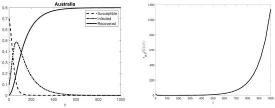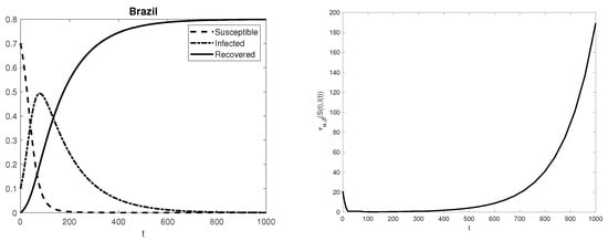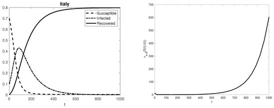 In this section, we aim to give numerical evidence of the arguments contained in the previous section, i.e., the spread of fake news is closely linked to the stiffness ratio of Equation (1). For each listed country, Figure 1, Figure 2, Figure 3, Figure 4, Figure 5, Figure 6, Figure 7 and Figure 8 show the solution of problem (1) in the interval [0,1000], computed by the standard Matlab built-in function ode15s, and the pattern of the ratio  between the maximum and minimum moduli of the non-zero eigenvalues of the matrix