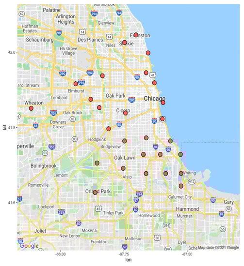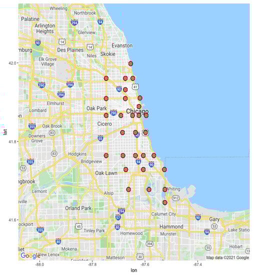 The datasets we use in this study are collected from the Chicago Transit Authority (CTA). The data include information about public transportation bus counts in Chicago and the neighboring areas. We select this dataset, due to the importance of public transport, which plays an essential role in the development of large cities and is considered an economical way of transportation. However, this mode of transportation is often involved in traffic congestion []. Understanding the public transit traffic data helps in improving public transport services and generally enhances road traffic management. The two study areas include 29 sensors, where the first dataset has spatial points distributed mostly in downtown Chicago. The second dataset contains sparsely distributed spatial point data as shown in Figure 1 and Figure 2. Both datasets include the number of buses, their speeds, and the number of sensor readings every 10 min from August 2018 to December 2019.