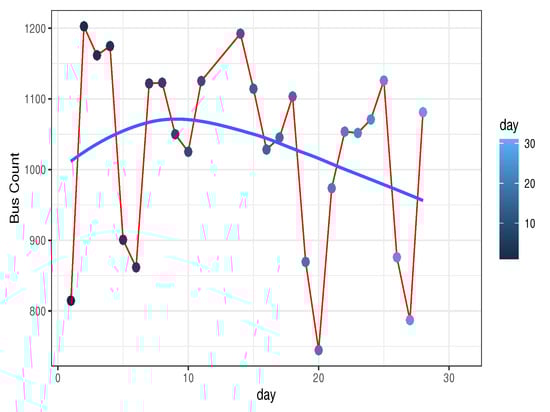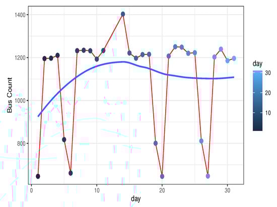 A quick exploration of the data presents the aggregate number of buses for each day as shown in Figure 3 and Figure 4 The reason we are showing this visual analysis is to illustrate the variations in traffic patterns over days, which does not exhibit normal distribution. Unlike most of the other spatiotemporal analysis techniques, HBM can efficiently deal with data that do not have a normal distribution [].