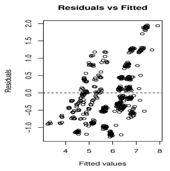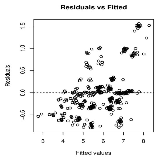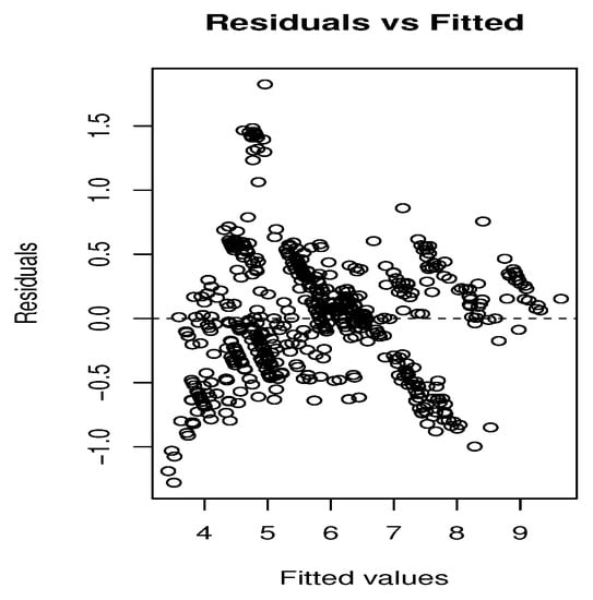 To provide a fair comparison, we concentrate on the results of the three models applied on the second dataset. The relationship between the residuals and the estimated responses that present the predicted response is shown in Figure 5, Figure 6 and Figure 7. Figure 5 illustrates the residuals estimation plot of the GP model, using the Matérn covariance matrix where Figure 6 and Figure 7 represent the residuals estimation plot of the AR and the GPP models, respectively. It appears that residuals roughly form around the zero line, especially in the GPP model. Additionally, most of the predicted responses fall on the estimated regression line. These points explain the relatively good correlation between residuals and fits. In Figure 5 and Figure 6, the mean residuals change with the fitted values, where the spread of the residuals increases as the fitted values change. In Figure 7, the residuals are mostly negative when the fitted value is small.