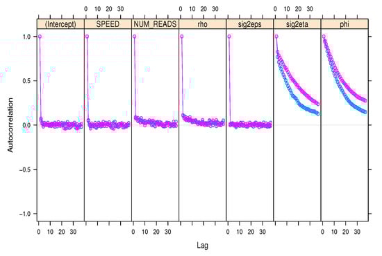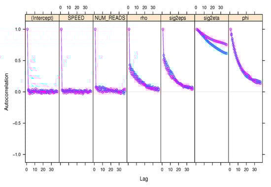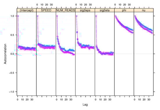 The autocorrelation coefficient estimation using two different lists of MCMC chains in the GPP model.