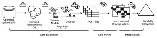 This step builds data conform to the input of the data-mining method (Relational Concept Analysis). It comprises five sub-steps: selection of representative operating systems (Section 3.1); building of Feature Models (Section 3.2); building of an ontology (Section 3.3); mapping between the FMs and the ontology (Section 3.4); building of a set of binary tables for RCA (Section 3.5).