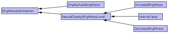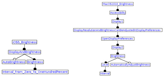 We do it concretely by exhaustively and manually exploring the accessibility options as users who would be creating their accessibility profile. We use the path which allows us to find the options of the mechanisms through the user interface to incrementally add the options and organize them in the FM. The FM is built with FAMILIAR (https://familiar-project.github.io/, accessed on 1 September 2021) (FeAture Model scrIpt Language for manIpulation and Automatic Reasoning) [27]. Figure 2 shows two FMs for brightness. The other FMs can be seen in the online repository (https://gite.lirmm.fr/AccessibiliteNumerique/osvisualaccessibilityoptions, accessed on 1 September 2021).