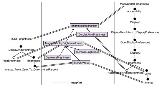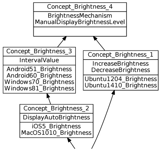 In parallel, a mapping between the specific features and the ontology concepts is established. Table 1 shows the 8 OS brightness features mapped onto the ontology. This is schematized for and in Figure 5. This mapping is very important because it traces the identified correspondences. It is also used to build standardized input data for the data-mining step. It shows, for example, that of and of are mapped to . of is mapped onto concept, making it a specialization of on which of is mapped. Accidental options, such as or are discarded from the ontology and the mapping. The two steps (ontology building and mapping) are summarized as follows (Box 2).