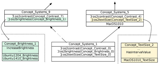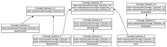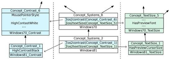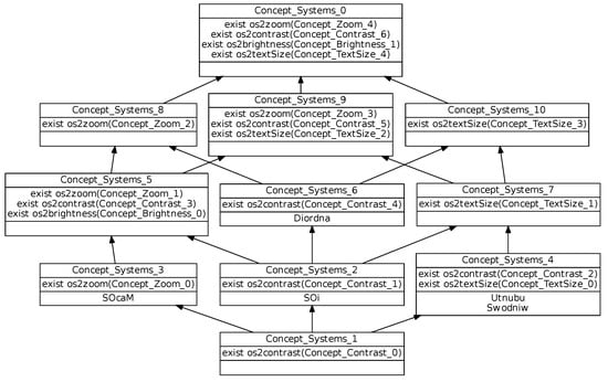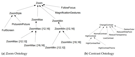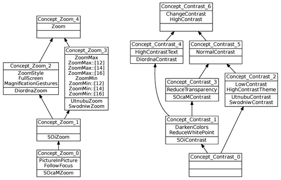 We switch to a fictitious smallest example, inspired by the real systems. This example allows us to illustrate all possible situations a conceptual structure may contain. We consider 5 fictitious operating systems: , , , , and . Figure 6 shows the parts of the ontology for 2 mechanisms (zoom, contrast) out of 4 (additionally including brightness and text style mechanisms). The whole example is available online (https://gite.lirmm.fr/AccessibiliteNumerique/osvisualaccessibilityoptions, accessed on 1 September 2021).