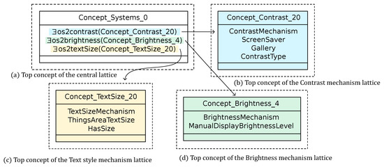 As previously shown, in our framework, the RCF is composed of a central formal context, describing operating systems, together with four formal contexts describing the different mechanisms and relations connecting the operating systems to the mechanism implementations. This is reproduced at the level of lattices. The central concept lattice, shown in Figure 8, combines information given in the different concept lattices defined for the different mechanisms. Its top concept () shows the relational attributes that are common to all studied systems. One example is relational attribute which indicates that all operating systems have at least one link towards an object in . This means that all operating systems have accessibility options that concern the contrast mechanism. More informative relational attributes will be presented hereafter.