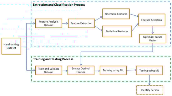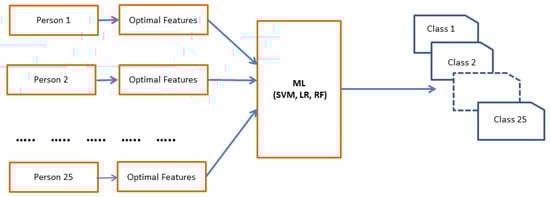 A general block diagram of the user identification model is shown in Figure 1. The model is divided into two major parts. In this research, the first part represents our main contribution to the experimental analysis. The first part consists of extracting different statistical and kinematic features from the dataset and the optimal feature selection process. The dataset is split into two subsets. The first subset is used to generate different optimal features using a hybrid feature selection process. Several kinematic and statistical features are calculated from the six parameters (time, pressure, x-axis, y-axis, horizontal angle, and vertical angle) of sensor signals from the first data subset. In this research, for better accuracy, we have considered both statistical and kinematic features. The proposed model introduces a hybrid feature selection algorithm to find out the important feature sets. In the second phase, training and testing are completed using the second data subset. Two third of the dataset is used for feature selection and training process and one-third of the dataset is used for the testing process. A machine learning technique is deployed to identify the person’s handwriting based on the classified optimal features set. We have used SVM, LR, and RF classifiers to compare the accuracy of the classified features in this research and to show the stability of our proposed model.