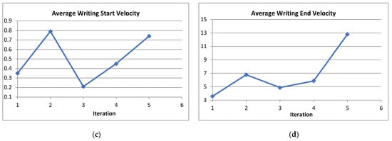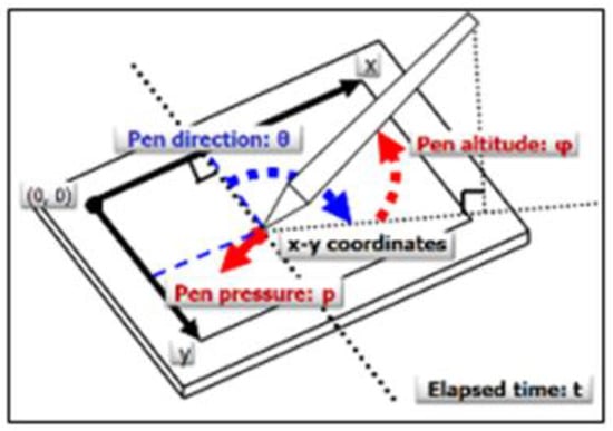 where, N represents the length of the input data of each person, is the elapsed time after the start of the test, is the writing pressure, is the positional coordinate in the horizontal direction, and is the positional coordinate in the vertical direction. The Y-axis velocity (vertical velocity) has been measured from its Y-axis value difference with its time variation at each iteration. The average velocity has been located using the length and square root of the velocity of the X-axis and Y-axis. The mean pressure has been calculated through the mean of writing pressure. The peak pressure has been calculated from the highest pressure which is greater than the mean pressure. The peak pressure is different from person to person.