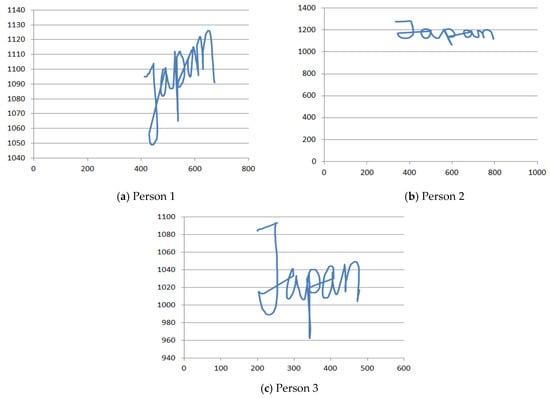 Figure 3. Writing graph with the x-axis, y-axis values for different persons for the same keyword: (a) Person 1 (b) Person 2 (c) Person 3.