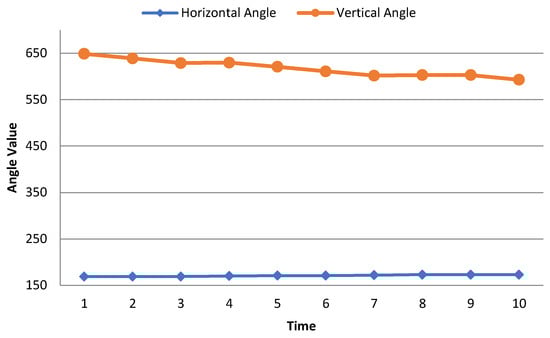 - Horizontal Angle: The horizontal angle is the dimension of an angle within two lines, rising from the same spot. This angle is automatically measured by the pen tablet. To uniquely identify a user, the horizontal angle is one of the major attributes of our work. The maximum range of horizontal angles in the data set is below 500. Figure 4 shows that the horizontal angle remains constant over time.