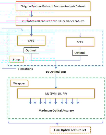 The whole process of optimal feature selection is shown in Figure 6. The filter-based feature analysis is an iterative approach that is conducted by SFFS. Initially, 25 users’ first and second datasets are applied for the training and validation respectively. The dataset is again randomly splitted into two equal parts for the training and testing process. The first equal part is then again divided into two equal parts to use in the filter-based approach. For testing in the wrapper approach, the second equal part is used. SFFS is applied in the first equal part where the process iterates five times and brings out the 10 sub-optimal feature sets. This process is repeated for the rest of the sensor data. Then the selected optimal feature sets are forwarded to the wrapper method. The wrapper method analyzes different optimal feature sets by using different machine learning algorithms to evaluate the best features.