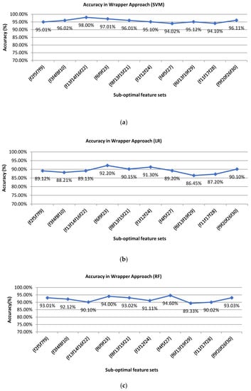 Classification accuracy of different sub-optimal feature sets in wrapper approach: (a) estimated by support vector machine (SVM) (b) estimated by logistic regression (LR) (c) estimated by random forest (RF).