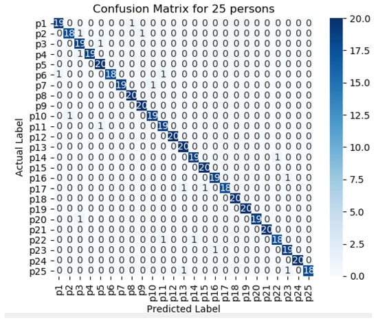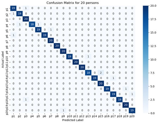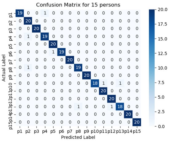 The performance matrices, accuracy, precision, recall, and F1 score achieve higher values such as 98%, 98%, 98%, and 98% respectively when the number of persons is smaller. However, when the number of persons is 15, then the values of accuracy, precision, recall, and F1 score are 97.3%, 97.25%, 97.35%, and 87.3% respectively where the performance is changing insignificantly which is practical.