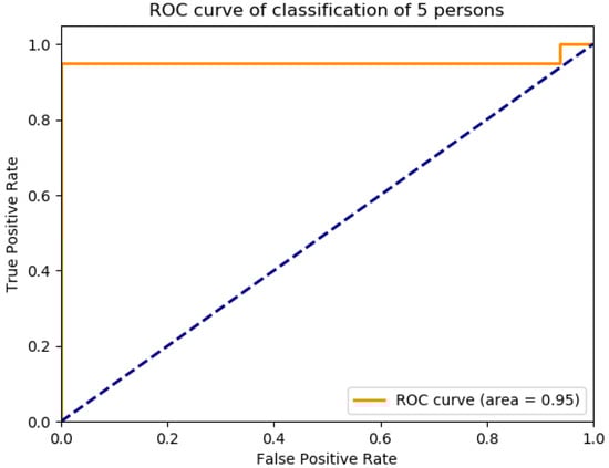 Figure 11, Figure 12, Figure 13, Figure 14 and Figure 15 represents the confusion matrix to visualize the performance of the implemented model in a contingency table for different number of persons with optimal feature sets. Figure 16 presents the ROC curve of classification of 5 persons. From the experiment, it is observed that in case of optimal feature selection, when the no. of person’s increases then the values of the performance metrics are not changing much which is satisfactory and stable. However, in case of no feature selection, these values are changing significantly. This is because, the distribution of large number of data in high dimensional feature space is more complicated and inefficient for classification.