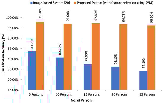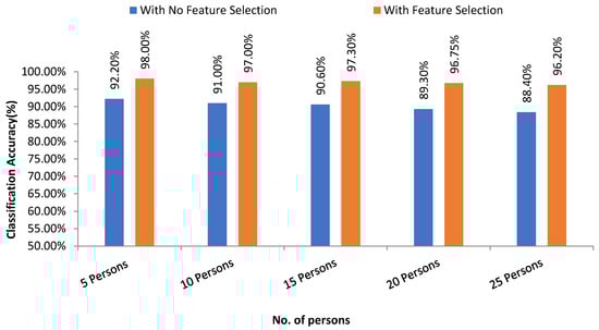 Figure 17 presents the overall accuracy of different groups of persons with feature selection and without feature selection using the SVM linear kernel technique. From the experimental analysis, it is found that our proposed system achieves higher results with the feature selection method than no feature selection process. For SVM, the highest accuracy with feature selection is 98.0% where that of which is 92.20% with no feature selection technique.