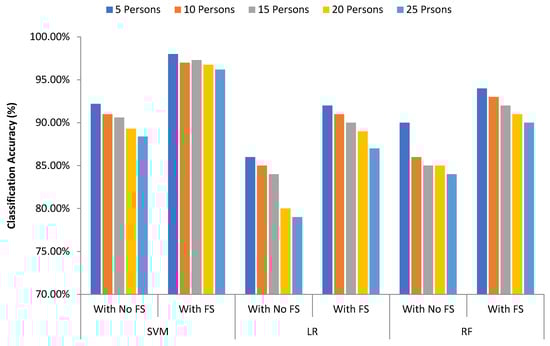 Three different machine learning algorithms are used to measure the classification performance of the proposed system. Figure 18 shows the comparison of classification results of different algorithms that are used in the proposed system for different groups of persons. We have compared the classification performance without feature selection and with the feature selection (FS) technique. SVM provides the best accuracy outcome than logistic regression and random forest. The accuracy values are 98%, 92%, and 94% in case of SVM, in case of LR, and in case of RF respectively with feature selection process.