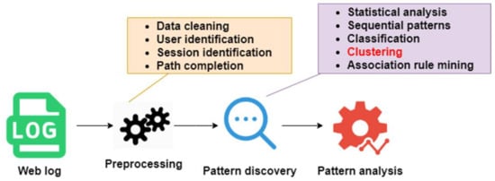 WUM comprises three main phases of pre-processing, pattern discovery, and pattern analysis [], as shown in Figure 1. In the pre-processing phase, the weblog data is first cleaned to remove the unnecessary contents such as the request of graphic files, scripts, and error logs. After that, user identification and session identification are performed to identify the unique users and to divide the navigation paths into individual sessions. Pattern discovery is the phase to extract the user behavioural patterns using different techniques such as statistical analysis, sequential patterns, clustering, etc. Pattern analysis will finally be able to extract interesting rules and patterns from the pattern discovery phase.