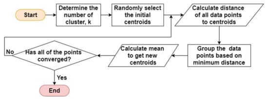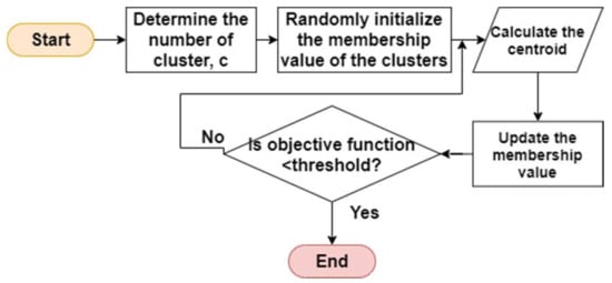 FCM works by assigning each data point corresponding to each cluster centroid according to the distance between them. The shorter distance between the cluster centroid and data point will create a higher membership value of the data point to the centroid. The membership value refers to the degree of which the data point belongs to the cluster, ranging from 0 to 1. In the traditional fuzzy clustering, the centroid of a cluster is determined from the average of all the points weighted by their membership value. In FCM, the parameter, m determines the degree of fuzziness. The m value should be larger than 1. If m = 1, the resulting cluster is crisp, in which each data point belongs to only one cluster. With larger values of m, the data point tends to belong to many clusters. Thus, a suitable m value should be selected to get optimal clusters [,]. The basic steps are illustrated in Figure 8.