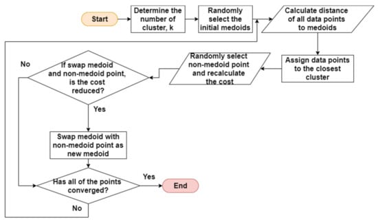 As k-means clustering is more sensitive to outliers, k-medoids clustering is claimed to be more robust than k-means because medoids are less influenced by outlier []. In [,,], the authors performed the traditional k-medoids clustering technique on the dataset. Ji et al. [] improved the clustering quality of k-medoids by not selecting the initial medoids at random. Instead, k data points that differ greatly from each other are added into the existing data and are used as the initial medoids, where k is the number of clusters. In [], Shinde et al. also modified the calculation of the centroid by introducing the alpha and beta values as the thresholds for choosing the initial medoids and determining if a particular data point is an outlier. As result, the improved k-medoids clustering can be executed in a shorter time since the algorithm does not randomly choose the medoid.