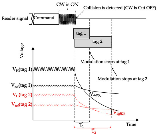 Initial voltage dependency: The initial voltage of the main capacitor before CW cutoff is not uniform for all tags due to different orientations and distances from the reader [9,15]. Hence, a predefined cutoff period that guarantees all tags to detect CW cutoff simultaneously is not feasible. This non-uniformity complicates protocol design by considering the most extended period that guarantees CW cutoff detection. However, this period is difficult to define for different types of readers, different antenna designs of tags, etc. An example of such a case is depicted in Figure 2, as two tags are sent simultaneously after the reader’s command. The two tags have different initial voltages at the main capacitor. The BT flag is triggered by the CWAD circuit if the rectifier’s output voltage becomes lower than the reference voltage level by a specific threshold denoted by . Thus, it is clear that Tag1 will detect the CW much earlier than Tag2.