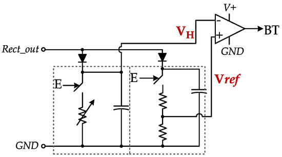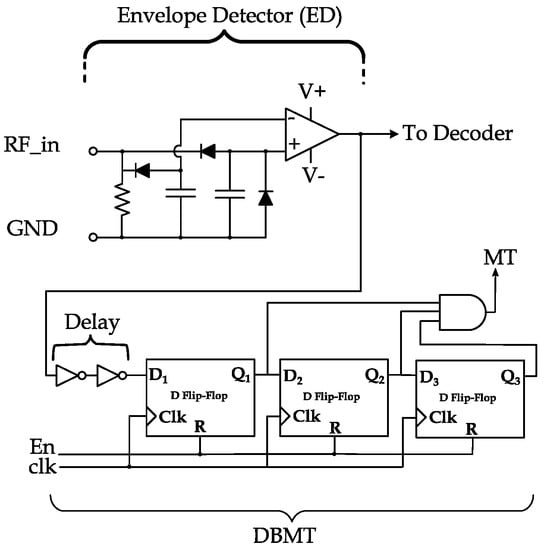 In Figure 5, the main components of the DBMT circuit and ED are shown. DBMT is enabled by the EN signal from the logic and memory module. DBMT, in its essential operation, consists of three synchronized D-flip flops (DFF) to latch and propagate the output of the ED. The output of the DBMT circuit is a flag noted as modulation termination (MT) flag, which is set if all DFFs output 1. Once set, the MT flag halts the impedance modulation for backscattering.