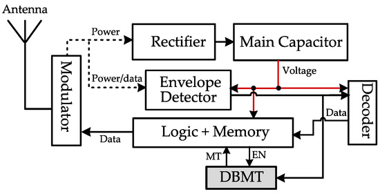 - Robustness to distance/orientation of the tags to the reader. The DMBT circuit is placed after the envelope detector module in the tag’s IC. This placement eliminates the possibility of resetting the far and/or poorly oriented tags due to the low harvested energy to start with [9,10,11].