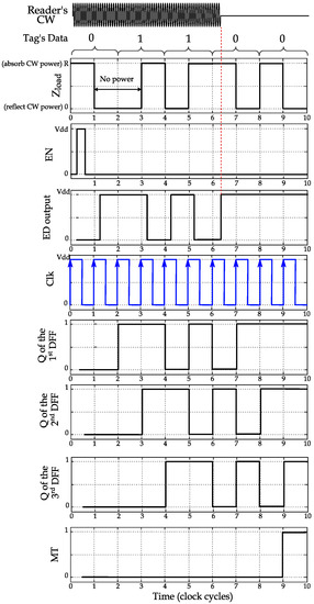 In Figure 6, a timing illustration is provided for the primary control and output signals in DBMT for a tag during backscattering. The EN control signal initializes DBMT (i.e., resetting the DFF outputs). The tag is to send a stream of bits starting by 01100···. Sending the “0” bit is encoded by a low period followed by a high period. Conversely, to send this “0” bit to the reader, the antenna impedance (Zload) is changed to R during the low period to absorb the CW signal, then to “0” to reflect it. Note that when the CW is reflected, no power is rectified by the tag and the ED produces a high level (as the output of the ED is inverted). The first DFF will follow the ED after one clock cycle, the second DFF after two cycles, and the third DFF after three cycles. As in the PIE encoding, there will be no three successive high periods, and the DFFs will not simultaneously produce a “1” at their outputs (s).