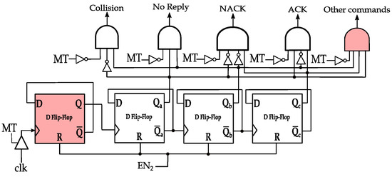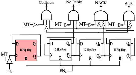 In Figure 7, MCI process command decoding circuit is shown for , , and of 4, 6, 8, and 10 clock cycles, respectively. Note that two clock cycles indicate the transmission of one symbol in PIE encoding, which is denoted by in the EPC standard documentation [16]. That is, , , and correspond to 2, 3, 4, and 5 symbol durations after MT assertion, respectively. The circuit is simply a ripple up-counter that is connected to the DBMT circuit. The counter is preceded by a frequency divider (the highlighted DFF in Figure 7) to output the number of symbols at which MT flag is asserted (i.e., high). If the count is two (i.e., ) and CW is resumed, the MT flag will no longer be high. The leftmost AND gate will assert flag, and a Collision command is assumed. Alternatively, flag is asserted if the count is three and CW is resumed, indicating an empty slot command. flag is asserted after CW resuming and the count is four (i.e., ), indicating a NACK command. Finally, if the count is five and the CW is resumed, will be asserted, and an ACK command is assumed. Following the CW transmission resumption, the control signal EN2 is pulsed to reset the counter for the next slot. Note that the assertion of the MT flag requires three clock cycles (1.5 symbol duration); therefore, are asserted after 7, 9, 11, and 13 clock cycles, respectively.