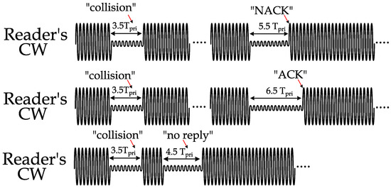 An example is illustrated in Figure 8 of the above commands. In the top waveform, the reader detects a collision (corrupted data that does not follow PIE encoding), stops the CW for 7 clock cycles (3.5 ), and then resumes its CW transmission. The received reply after that CW resumption was from a single tag, but for some reason, it has an erroneous CRC; the reader then negatively acknowledges the transmission by stopping the CW for 11 clock cycles (5.5 ). In the middle waveform in Figure 8, the data are received from a single tag after a collision slot, and the CRC was correct. Hence, the reader acknowledges the tag’s transmission by stopping the CW for 13 clock cycles (6.5 ). In the bottom waveform of Figure 8, no reply is detected from any tag after the collision (since in standardized anti-collision protocols, tags decide randomly to reply or not to reply). Therefore, the reader cuts off the CW for nine clock cycles to indicate an empty (no reply) slot and the beginning of a new slot.