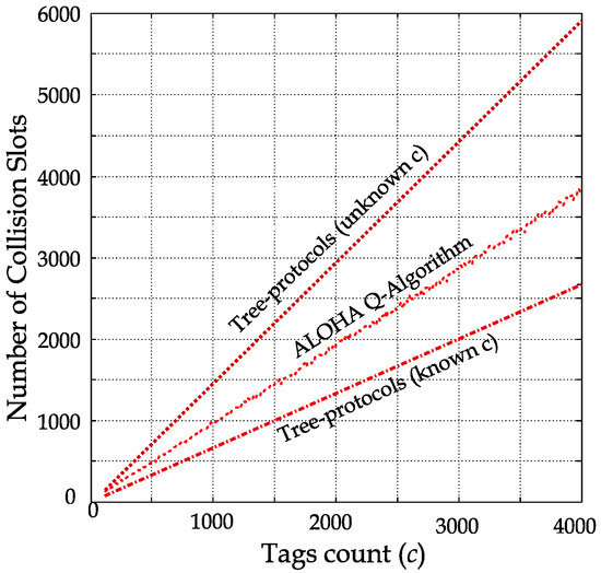 In deterministic (tree-based) protocols, the total number of collision and empty slots depends on the tag population’s pre-knowledge [14,19]. Therefore, the ratio of collision and empty slots to the total slots consumed in the identification process will be smaller if the tag population is known when compared to an unknown tag population.