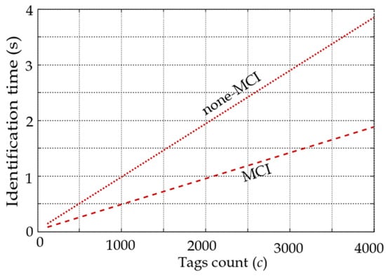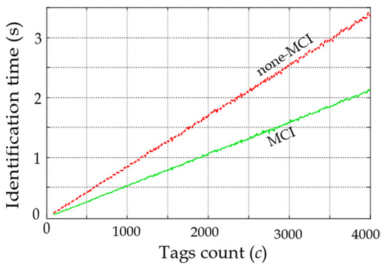 In Figure 12, the average identification times for different tag populations in the deterministic tree-based protocol for unknown tag populations are shown. The reported results are the simulation of this protocol with and without the MCI process based on standardized timing [16]. The speedup of the MCI process is 50.1% compared to the none-MCI (standardized slot structure) process. A similar speedup is perceived with 41.4% of the MCI process over the non-MCI process when the tag population is known.