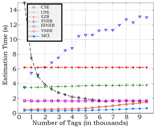 The MCI process is applied to the variance and modulation silencing-based estimations (VMSE) algorithm [20]. The performance of the MCI process is compared to the combined simple estimator (CSE) [21], the unified probabilistic estimator (UPE) [22], and the enhanced zero-based (EZB) estimator [22], FPNE estimator [23], and variance and modulation silencing-based estimations (VMSE) [20]. In Figure 13, the average counting times were plotted for counting with a 5% confidence interval (the average over 100 simulation runs) for tags that count from 1000 to 9500 tags.