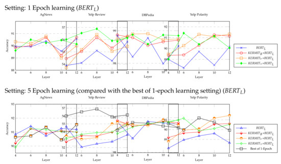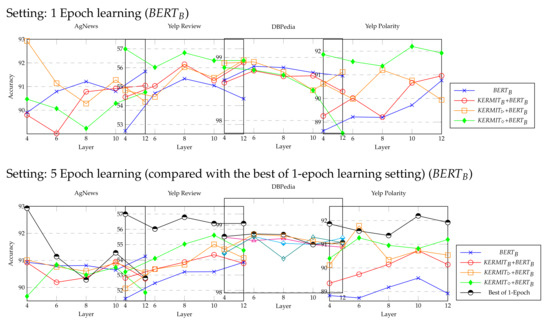 In fact, it seems that different BERT layers encode different information Jawahar et al. [59]. Hence, learning different layers in a specific setting means adapting that kind of information. As mentioned earlier we experimented under the computationally lighter setting where training is done only for one epoch and the more expensive setting where training is done for five epochs.