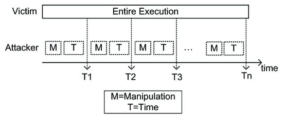 Flush+Reload and Flush+Flush are two types of cache side channel attacks. They both take the last-level cache as a covert channel for information leakage. Flush+Reload and Flush+Flush rely on the operating system’s or hypervisor’s shared memory technology, whereas Prime+Probe [7,8,9] does not. Flush+Reload and Flush+Flush pose a great threat to information security, so we study the detection method of these two attacks. In the scenario of these attacks, there is a victim and an attacker. Typically, the victim is a cryptographic program. The attacker’s goal is to steal the victim’s secret key.