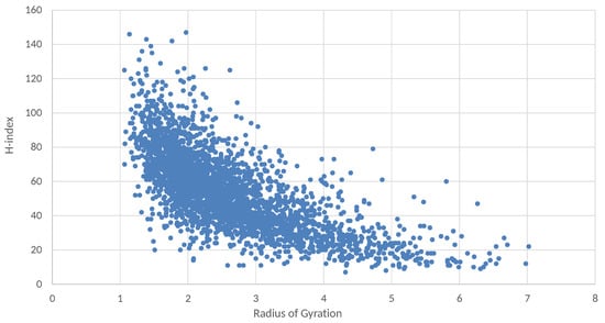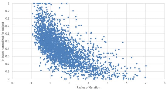 Since this analysis regards scholars working in very different subject areas, in Figure 5 data are distinguished by the subject areas associated with scholars on Scopus. Subject codes are defined in the Scopus API (https://dev.elsevier.com/documentation/ScopusSearchAPI.wadl, accessed on 8 January 2022). In particular, in graph (a) the analyzed scholars are colored by subject area. It can be observed that some groups of scholars of certain subject areas are represented by nearby points and, also selecting each subject area, the two considered variables are anti-correlated. In fact, considering the most represented subjects, the following important values of anti-correlation can be observed: MATH, −0.636; MEDI, −0.677; ENGI, −0.531. To better highlight some possible differences among subjects, graph (b) also shows the average values of the Radius of Gyration and the H-index, grouping scholars by subjects. According to the results, researchers of different subjects behave differently, and also these average values are scattered approximately along a line with a negative slope. The subjects with the highest values of the Radius of Gyration are Economics and Business. In [38], it is shown that the differences among the average H-index calculated for each disciplinary field (or Scopus subject) can be largely accounted on both the career length and the average number of authors per article in the various fields. Figure 5 shows that in correspondence with the lower average H-index in the cases of Economics and Business, the mobility across research topics measured by the Radius of Gyration is higher.