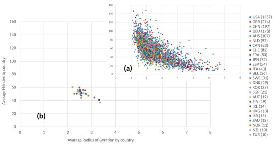 Finally, Figure 6 takes also information about countries into account. ISO-alpha3 country codes are used (https://unstats.un.org/unsd/methodology/m49/, accessed on 8 January 2022). In particular, in graph (a) the analyzed scholars are colored by country, in fact, by the country of their affiliation institution. Furthermore, grouping data by country, dots with the same color are not uniformly distributed. Considering the most represented countries, a significant anti-correlation can be observed, similarly to the general case. Considering, for example, the most represented countries, the following important values of anti-correlation can be observed: United States, −0.6826; UK, −0.72154; China, −0.51519. Graph (b) also shows the average values of the Radius of Gyration and the H-index, grouping scholars by country. While the values are distributed over a smaller region than Figure 5, the graph shows that slight differences also exist among countries and, also, in this case, average values are scattered approximately along a line with a negative slope.
