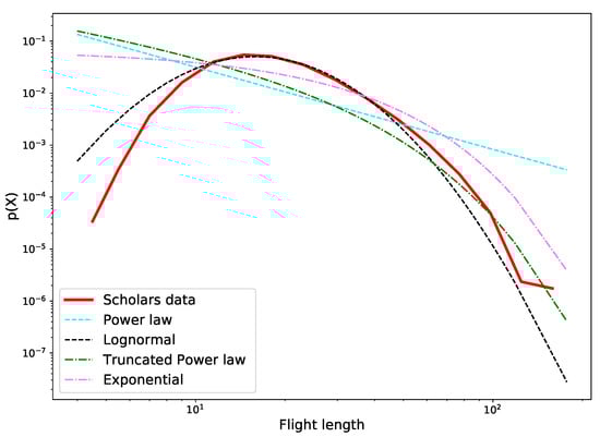 Modeling the authors’ research activities as travel in a semantic space enables investigating another kind of result, related to the emergent patterns in the authors’ trips in this space over the time. In particular, we looked for a mobility pattern considering the displacements between visited locations in consecutive years (flight length) by each author. Understanding these patterns may be of interest for different stakeholders because it is possible to estimate the probability that a change of a topic occurs among the top scholars analyzed. For example, it could be considered in the evaluation criteria that occur in many different national academic systems or even to evaluate research projects or their management. Before discussing the specific findings, in this section we present the methodology that we have used and the kind of results obtained. This kind of analysis can be seen as borrowed from the Human Mobility field, where it emerges that the length of human travels can be described by a Power Law distribution in general [1,39] and by a Lognormal distribution if analyzed with a transport modality decomposition (walk, car, bike, train, airplane) [18,40]. In our analysis the scholars travel among the topics, modeled as the estimated locations. We have studied the mobility for each scholar and for each year, as discussed in Section 4.4. The distance between two consecutive locations is measured with the Euclidean distance. The Probability Density Function (PDF) was computed over the frequency of displacements, in order to estimate which distribution can better describe the authors’ mobility across the topics. We have considered the following distributions: Power law, Truncated Power Law, Exponential, and Lognormal. The following methodology was adopted to select which distribution best fits the scholar data:
