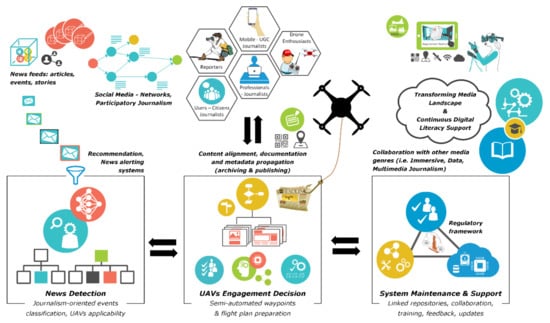 The current work proposes a framework for functioning and supporting drone journalism services, incorporating the existing regulatory framework, security, and ethical matters [8,27,28]. In this context, the technological and functional capacities of drones, i.e., the capability to create powerful narratives, will be combined with a structured and automated way of operation, including alerting, control data transfer, and normalization services. The system is modular, able to integrate UGC and news alerts sent by mobile journalist devices, making use of the inherent localization and networking capabilities [25,29,30,31,32,33], or even cooperative drone monitoring, thus offering time-, location- and context-aware data-driven storytelling. This will lead to the faster and more reliable detection of breaking news with their contextual and spatiotemporal attributes, using crowd computer intelligence techniques with appropriate weighting mechanisms. Modularity does not only concern the retrieval and the processing stage but the output forwarding as well. Alerts will also be sent to mobile journalists to let them cover the event too. Diverse drone footage and UGC mobile streams can be combined to offer a more holistic coverage of the events.